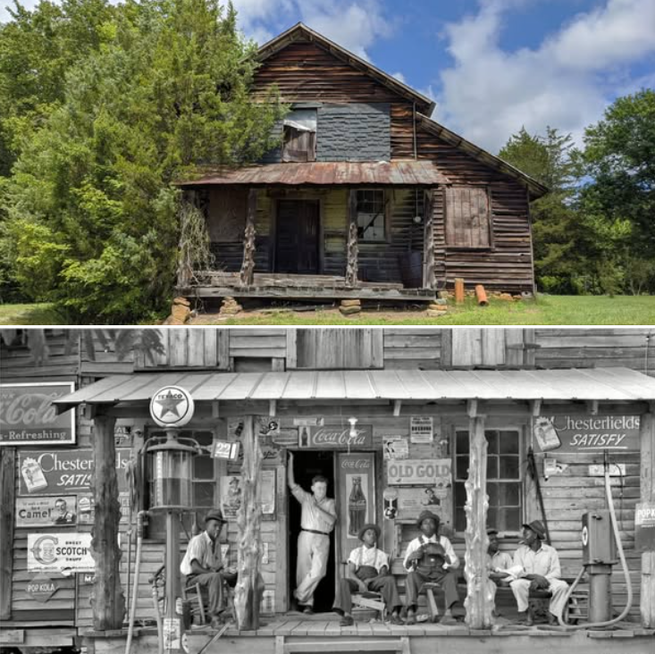 In 1942, just a few years after Dorothea created this image, the man standing in the doorway, Rainey Curry Baynes II, passed away and the store closed for good shortly after. The community of Gordonton never grew to be much more than a quiet rural crossroads. In the years that followed, more and more people moved out of the area, looking for more opportunities in bigger cities. Today, the building stands here at this corner just as it has for more than 100 years, although it’s only used for storage now. The friendly neighbors on the porch are long gone as well as many of the signs that you can see in Dorothea’s original photograph from 1939.