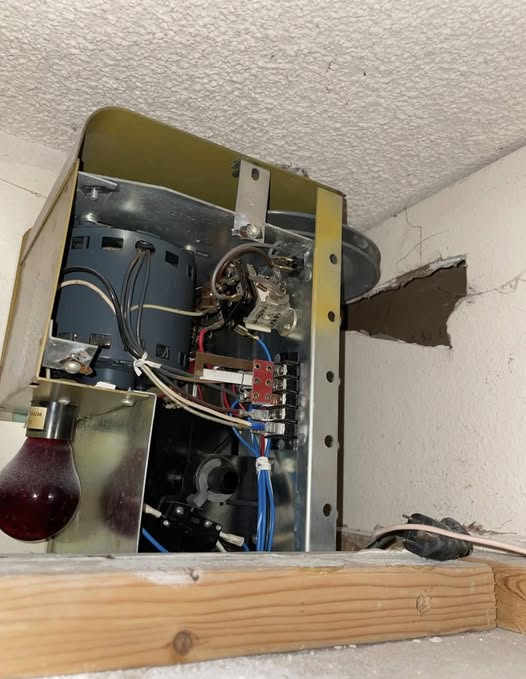 While going through the attic, I noticed something strange behind the drywall. It kind of looked like a fan motor and an old electrical panel mixed together. There was a red bulb that said “MEDIUM”, a belt-driven thing, and a pile of old wiring. It was dusty, of course, and was obviously silent from not seeing the light of day for years! It turned out to be a Montgomery Ward garage opener.