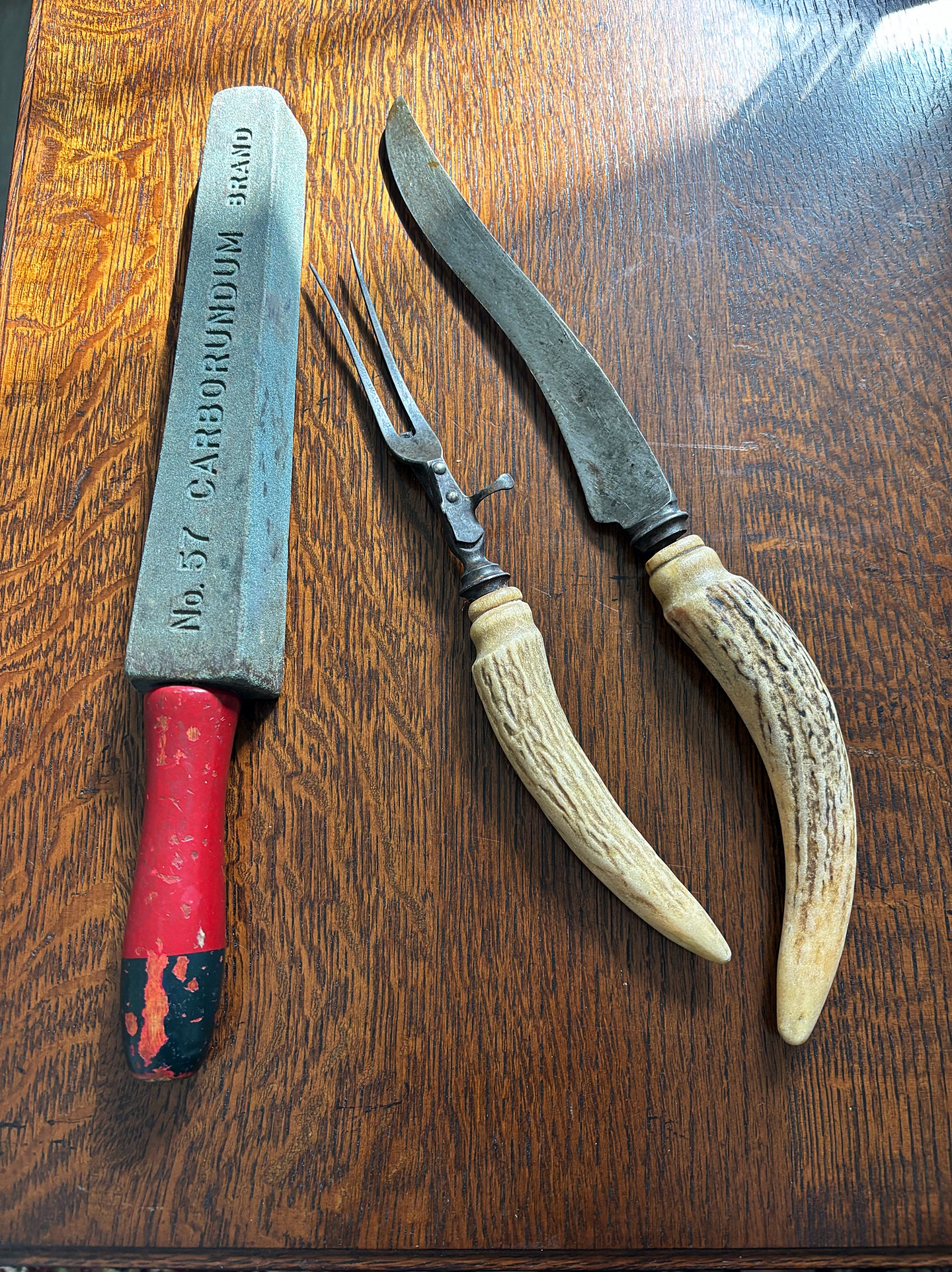 Preserving an old carving knife and fork requires gentle care. Unlike stainless steel, high-carbon steel can rust if left damp, so it should always be hand-washed and thoroughly dried. Occasional honing keeps the edge sharp, while a light oiling of the blade and handle helps prevent wear. If the handles are made of bone or wood, avoiding extreme temperatures and moisture will protect their natural patina.