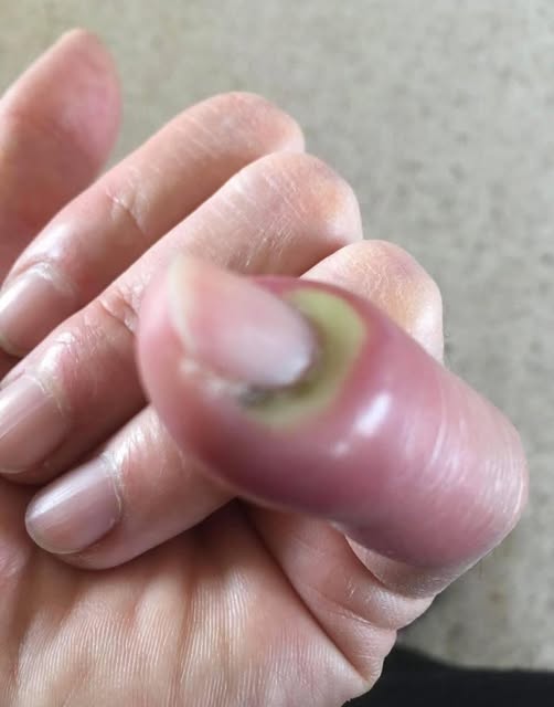 After some research (and advice from friends), it looks like my finger has an infection — probably from the trauma combined with bacteria getting in through the little cut or skin break. Here’s what people suggest for at-home care: