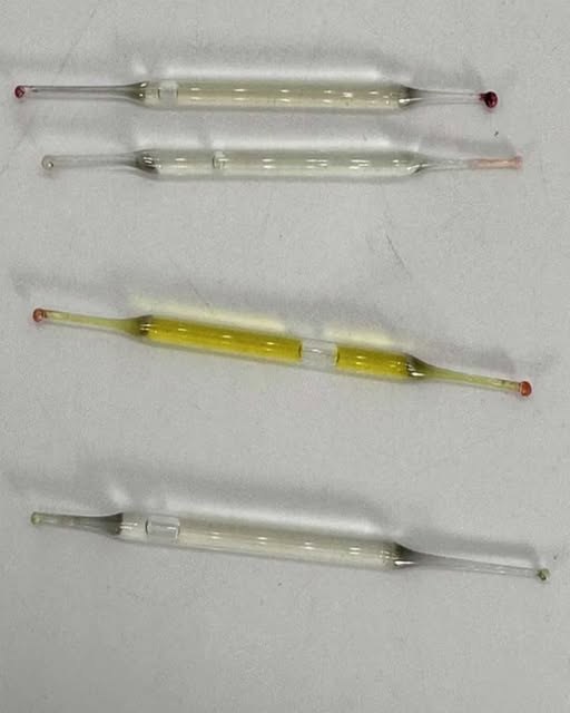 A likely explanation is that these tubes are vintage perfume ampules. Mid-20th-century perfume makers responded to the demand for portable, single-use fragrances by creating small glass vials containing concentrated perfume. These ampules allowed users to carry their favorite scent easily, without the bulk of a full-sized bottle, with the sealed glass preserving the fragrance’s potency over time.