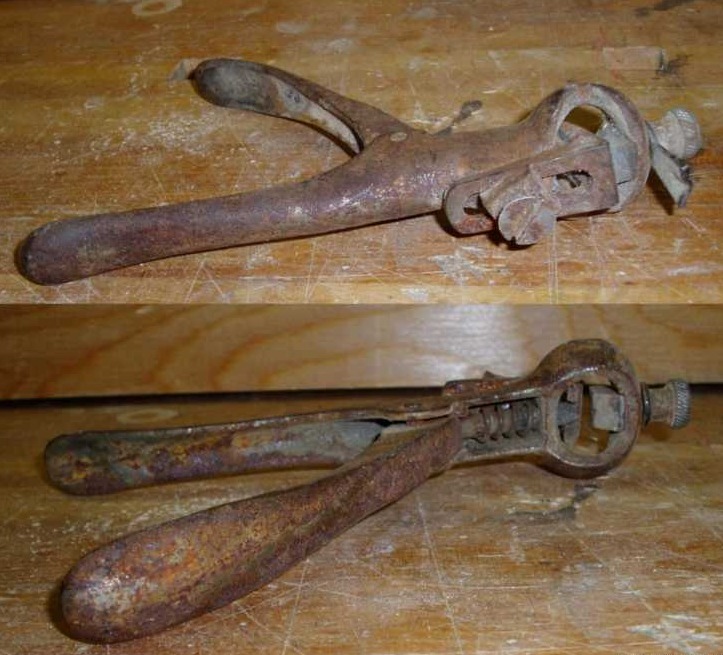 4) This handled tool has a spring and a screw on the top. Looks pretty heavy duty. Think you know what this was used for?