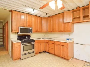 The kitchen is thoughtfully positioned to maximize functionality, offering ample space for meal preparation and storage. With a few modern updates, it could easily be transformed into a warm and inviting culinary hub.