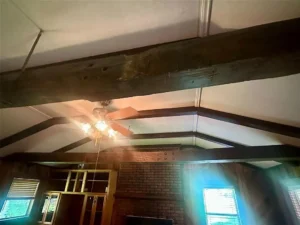 Step inside and you’ll immediately feel at home. The living room is spacious, with exposed wood beams adding warmth and character to the space. It’s the perfect place to gather with family and friends, whether you’re watching movies, playing games, or relaxing by the fire on a cool evening.