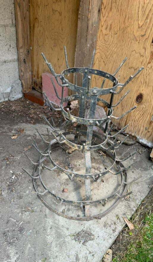 Its design looks almost industrial to modern eyes: a strong metal frame with tiers of outward-reaching arms, each ending in a small upward hook. Glass bottles hung from the hooks by their openings so water could drain naturally while air flowed inside. It was practical, durable, efficient — the kind of tool meant to last decades, not months.