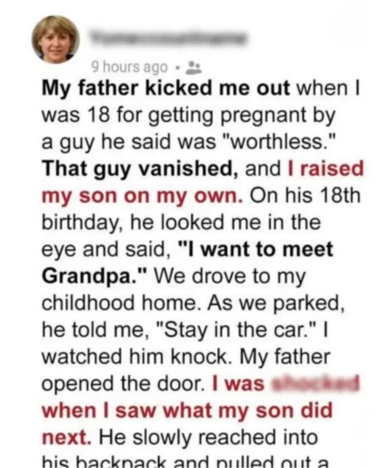 I was seventeen the day my world changed forever. One moment I was a scared girl holding a secret, and the next, I was being pushed out of the only home I knew. When I told my father I was expecting a child, he didn’t yell or slam doors — he simply opened it and asked me to leave. No hug, no hesitation. Just silence and a porch light behind me. I remember standing there with nothing but a duffel bag and a tiny life inside me, wondering how a single sentence could erase a childhood. Eighteen years later, that child — now a man — stood at that same doorstep with a message my father never expected.