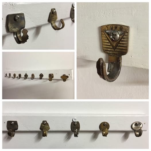 Here’s a clever twist on the classic key holder: using actual old keys as the hooks. Each key is cut and bent to form a small hanger, then screwed into a wooden board for a quirky, practical display.