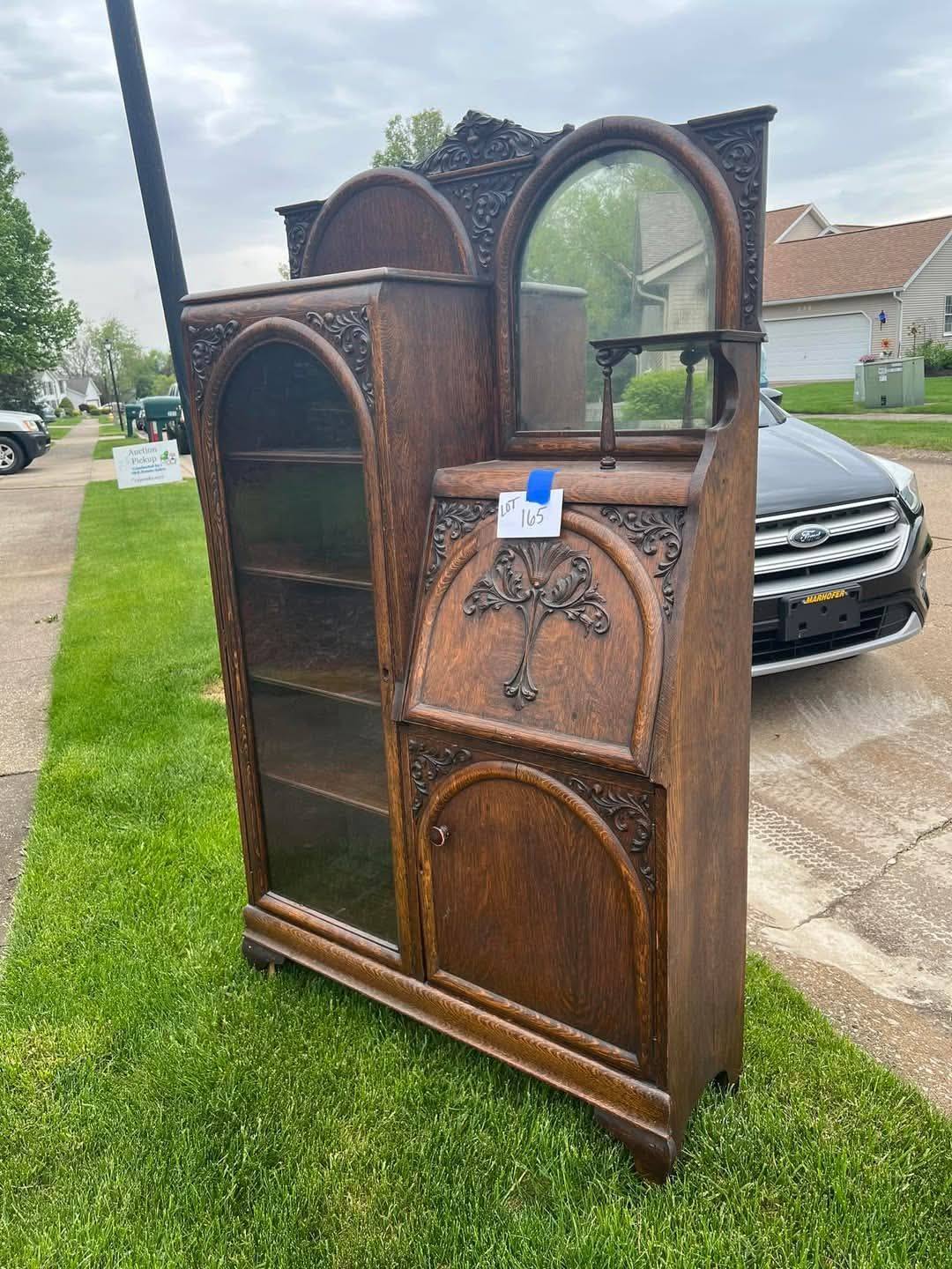 He claims it would “brighten the room” and “look more modern” but I think painting over that original carved wood detail is basically a crime against history. Look at that tree carving, those arched glass doors, the intricate details someone spent hours creating. This piece is easily from the early 1900s based on the construction, and he wants to cover it in chalk paint like it’s some IKEA bookshelf.