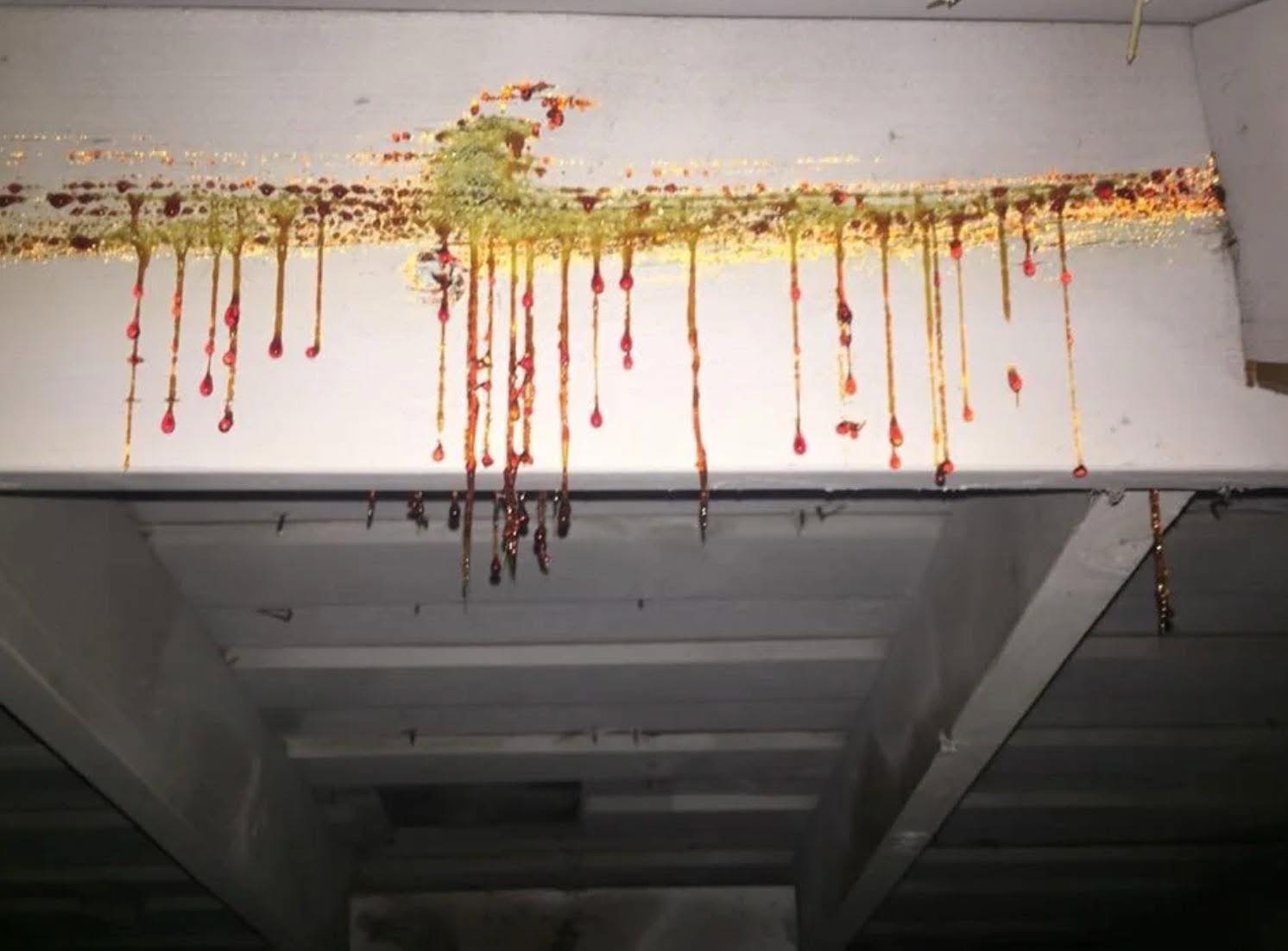 Resin can leak out of wooden structures over time, especially if the wood contains knots. These resinous knots are more common in pine and other softwoods. What triggers the leakage is often a rise in temperature. When it gets hot—like in an attic during summer—the resin heats up, softens, and drips out of the wood. This process can take many years, so it’s not uncommon to see resin leakage from wood that’s decades old.