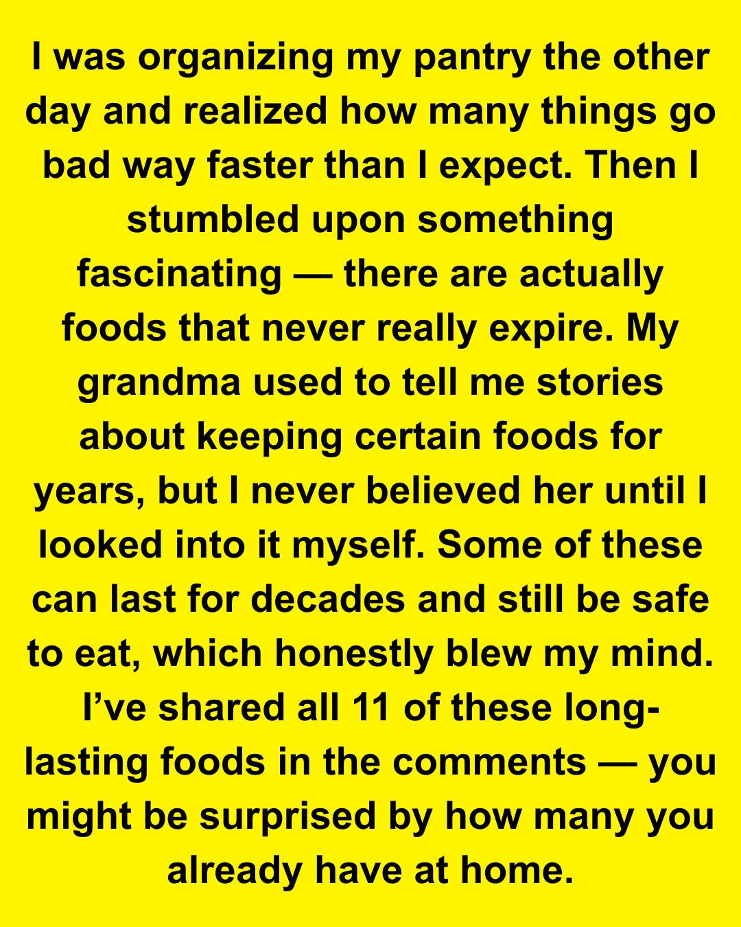There are certain foods that we’ve had in our pantry for so long, we just assume that they must have gone bad by now. However, there are certain foods that never expire… no matter how long you hang onto them for! Here are 11 foods that you should never throw away because they’ll never go bad.