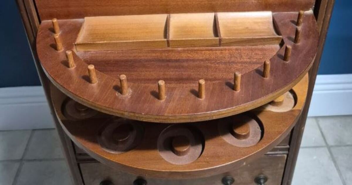 Revolving shelves that have wood pegs for thread spools — because, like, I mean what, let’s even just be real, which it is so good and right that have ev-ery-thing is stand up in same row like this. It’s all thanks to the design of the vintage sewing cabinet.